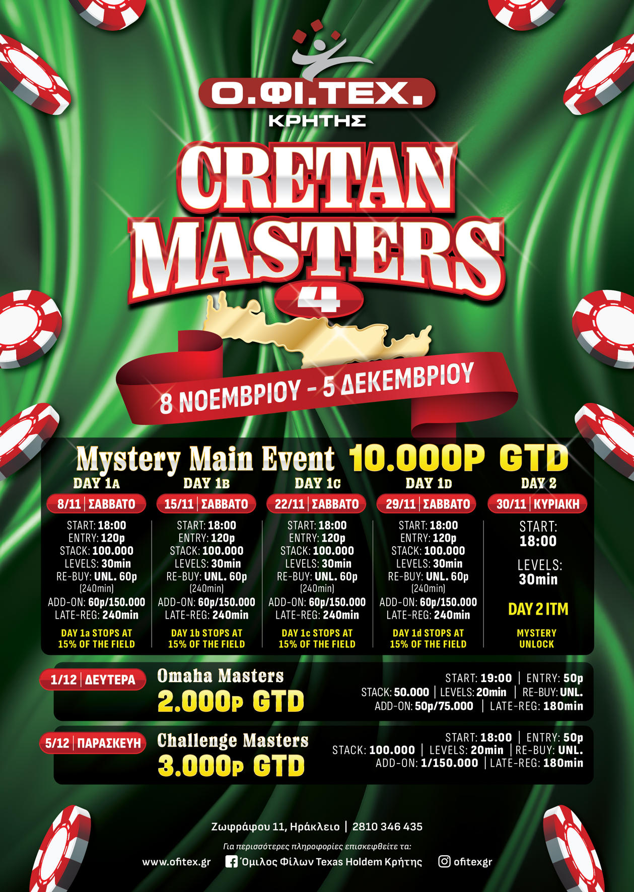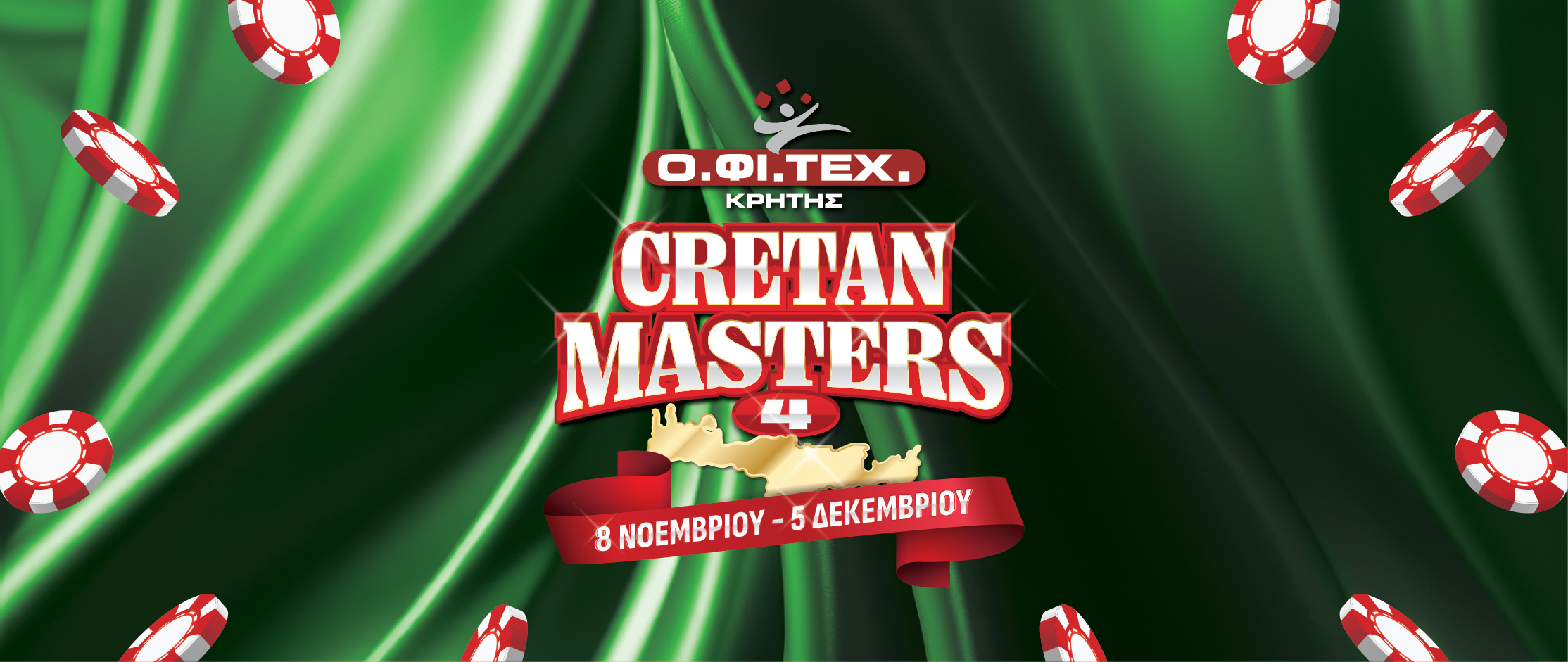 O.FI.TEX Crete presents Cretan Masters IIII, from November 8th to December 4th, with 10,000p GTD in the Mystery Main Event and 2 more adrenaline-filled tournaments! ♠️♥️